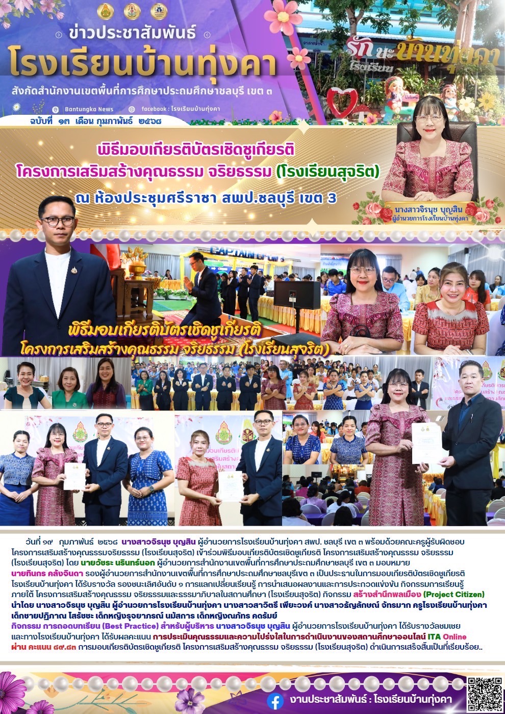 พิธีมอบเกียรติบัตรเชิดชูเกียรติ โครงการเสริมสร้างคุณธรรม จริยธรรม (โรงเรียนสุจริต)