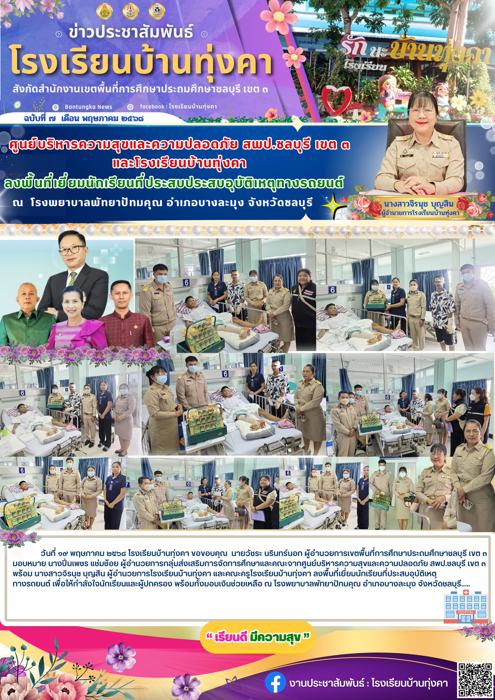 ศูนย์บริหารความสุขและความปลอดภัย สพป.ชลบุรี เขต3 ลงพื้นที่เยี่ยมนักเรียนที่ประสบอุบัติเหตุทางรถยนต์