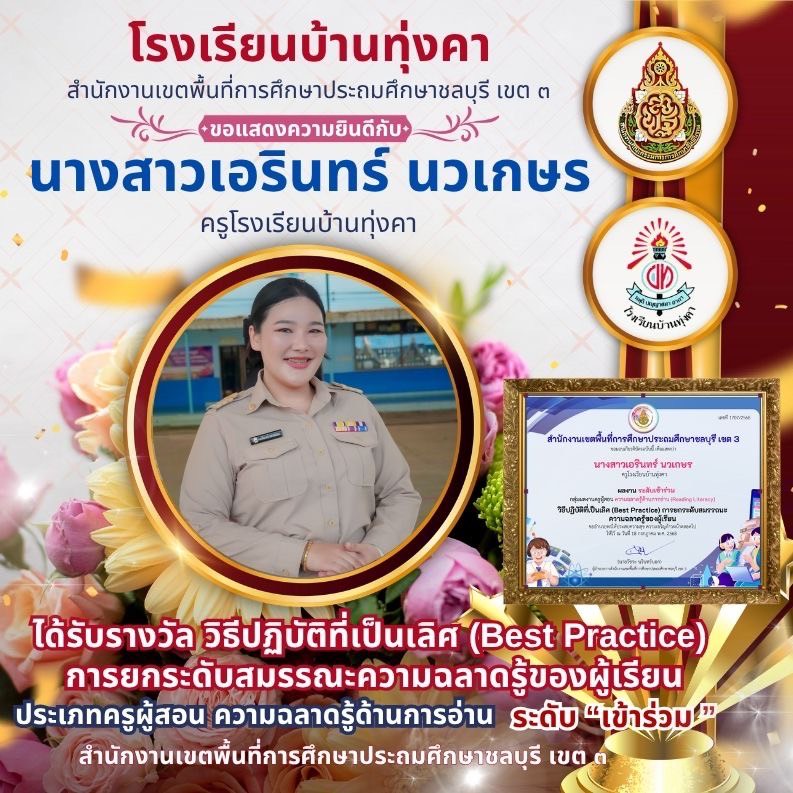 นางสาวเอรินทร์ นวเกษร ได้รับรางวัล วิธีปฏิบัติที่เป็นเลิศ (Best Practice) การยกระดับสมรรถนะความฉลาดรู้ของผู้เรียน ประเภทครูผู้สอน ความฉลาดรู้ด้านการอ่าน ระดับ "เข้าร่วม"