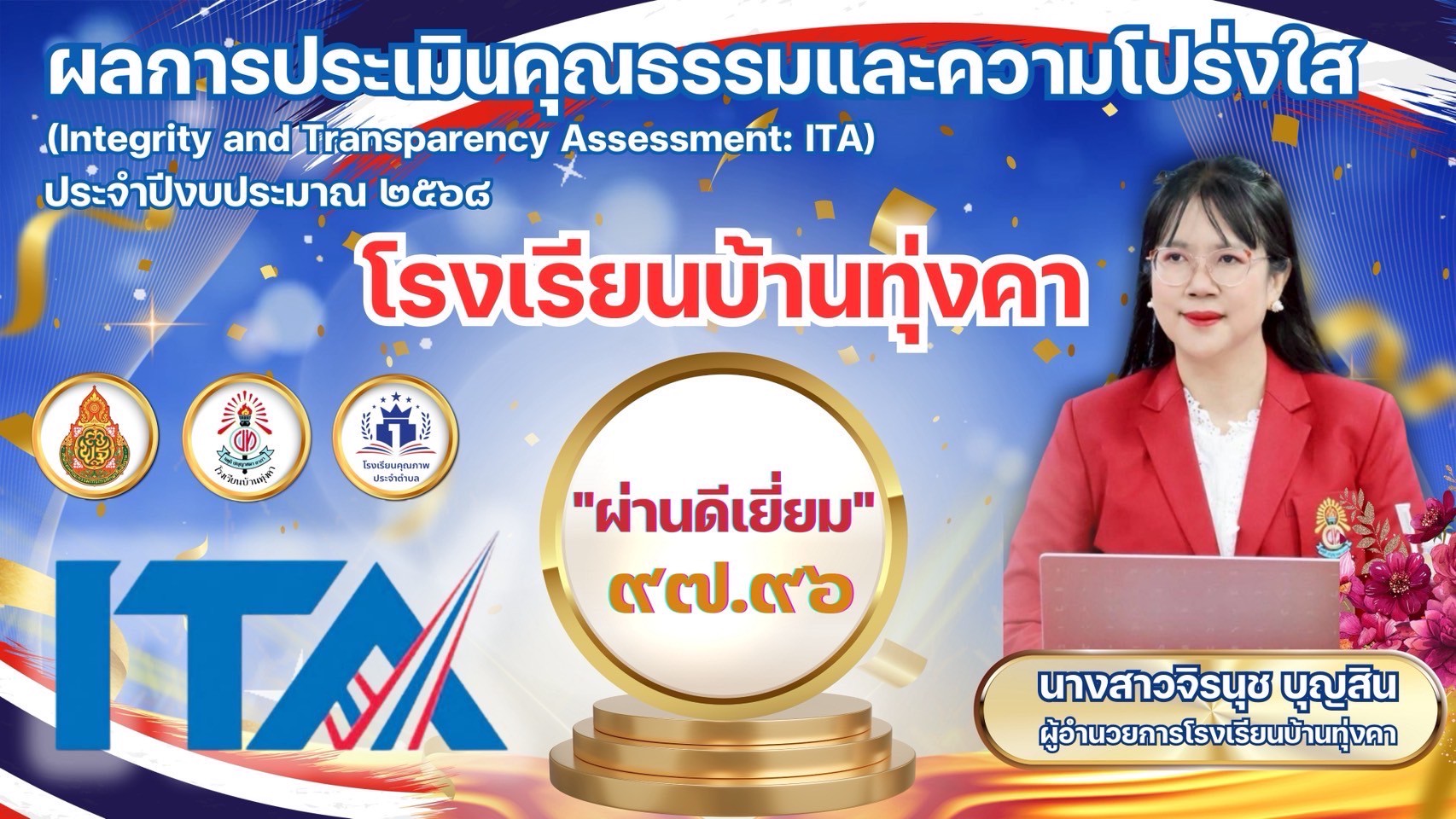 ผลการประเมินคุณธรรมและความโปร่งใส (ITA) ประจำปีงบประมาณ 2568 โรงเรียนบ้านทุ่งคา ได้ระดับ "ผ่านดีเยี่ยม" 97.96