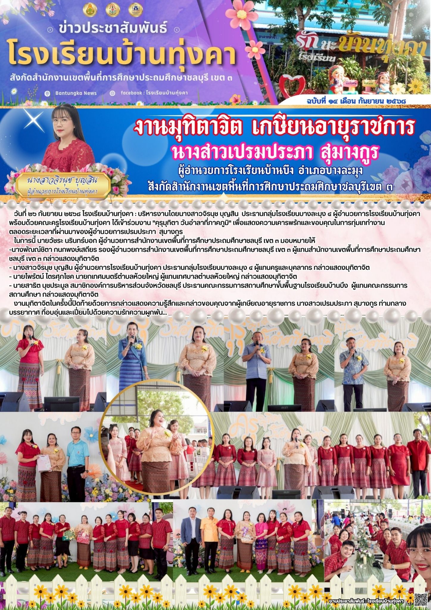 งานมุทิตาจิต เกษียนอายุราชการ นางสาวเปรมประภา สุมางกูร ผู้อำนวยการโรงเรียนบ้านบึง อำเภอบางละมุง